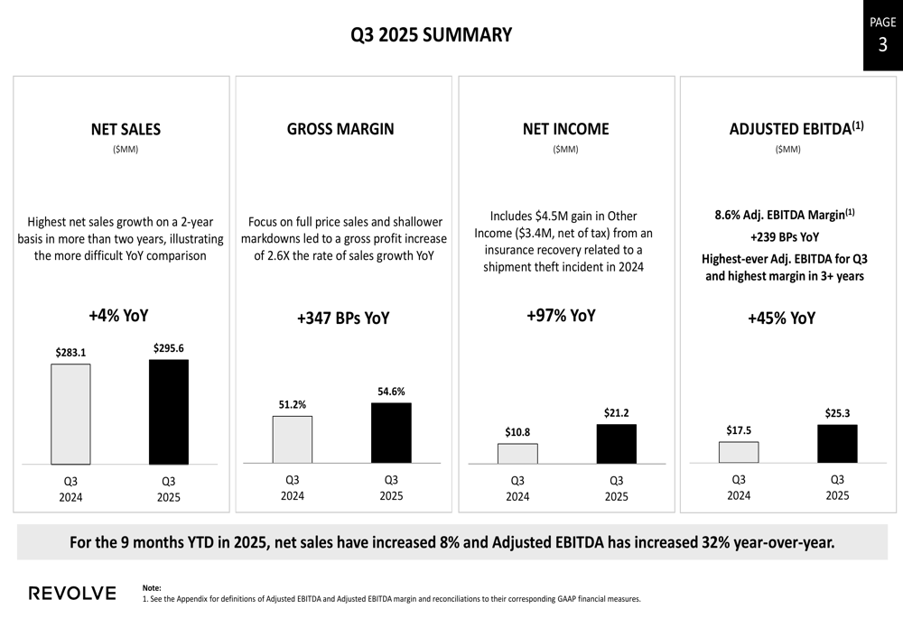 Revolve reported net sales of $295.6 million for Q3 2025, representing a 4% year-over-year increase. While this growth rate was modest, the company achieved its strongest profitability metrics in several years, with gross margin expanding by 347 basis points to 54.6% compared to 51.2% in Q3 2024.