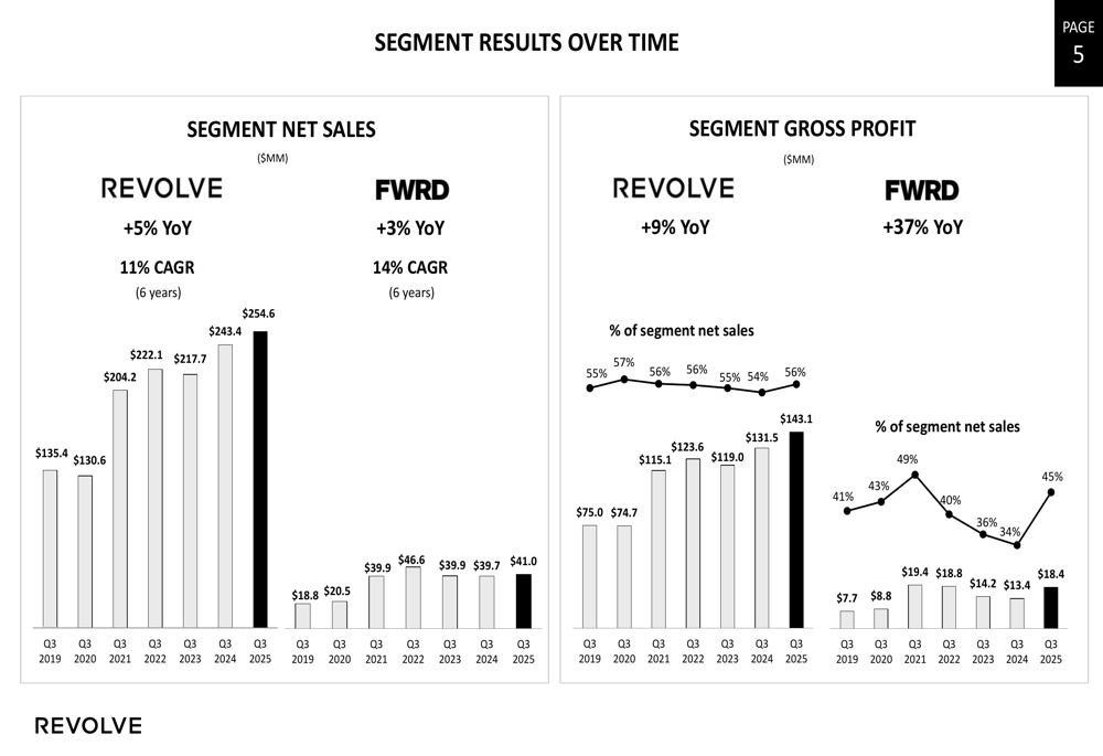 The company’s long-term growth trajectory remains impressive, with the REVOLVE segment achieving an 11% CAGR over six years and the FWRD segment growing at a 14% CAGR during the same period: