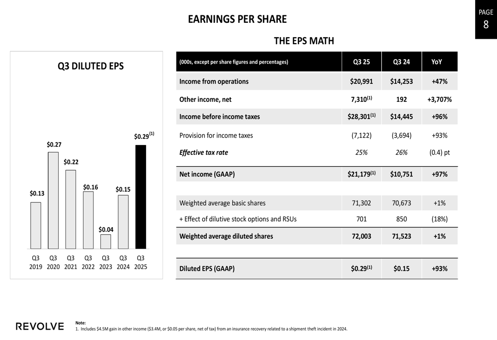 The company’s balance sheet remains exceptionally strong, with $315.4 million in cash and cash equivalents. Revolve also continued its stock repurchase program, buying back 14,612 shares at an average cost of $19.36 per share during Q3.