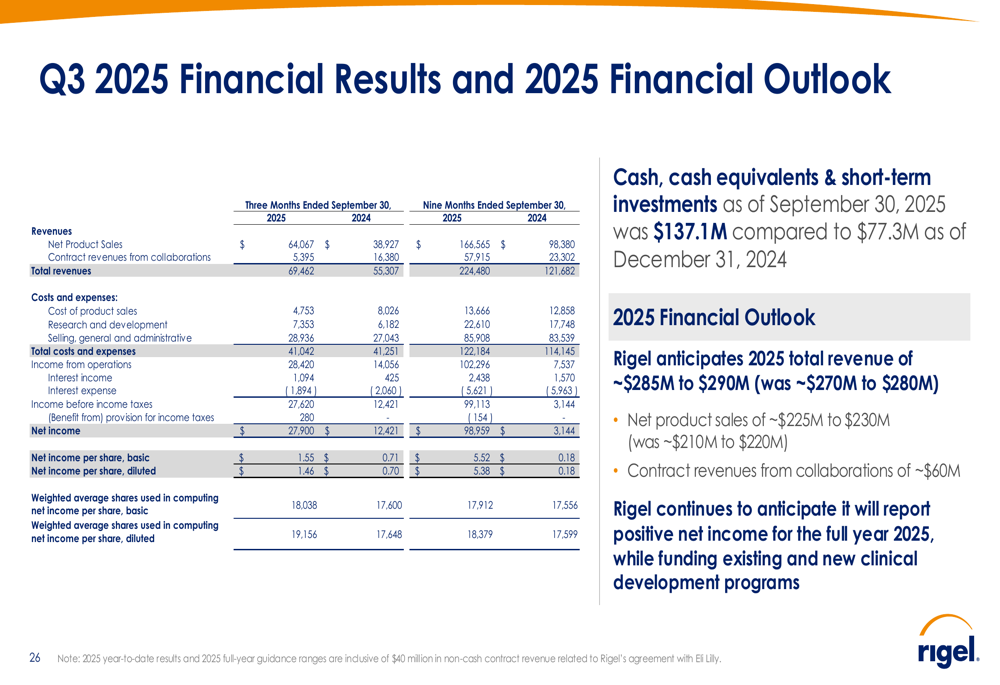 The following slide summarizes Rigel's Q3 2025 financial results and updated outlook: