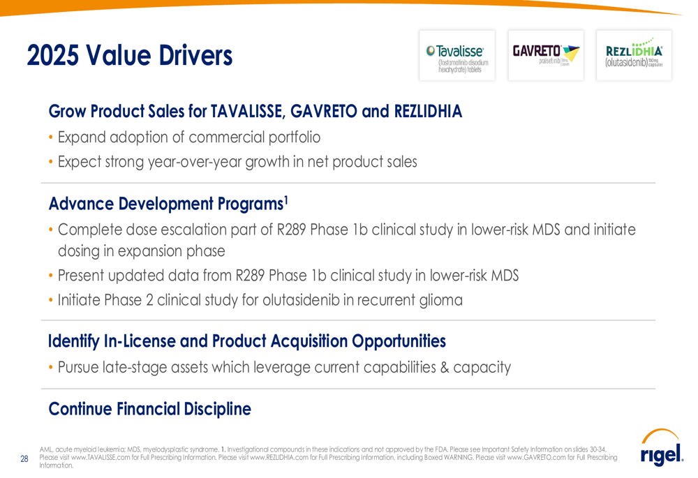 Looking ahead, Rigel has outlined several value drivers for the remainder of 2025 and beyond: