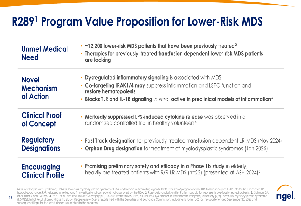 Rigel is advancing several development programs to expand its product portfolio. The R289 IRAK1/4 inhibitor is being evaluated in a Phase 1b study for relapsed/refractory lower-risk myelodysplastic syndromes (MDS), addressing a significant unmet medical need: