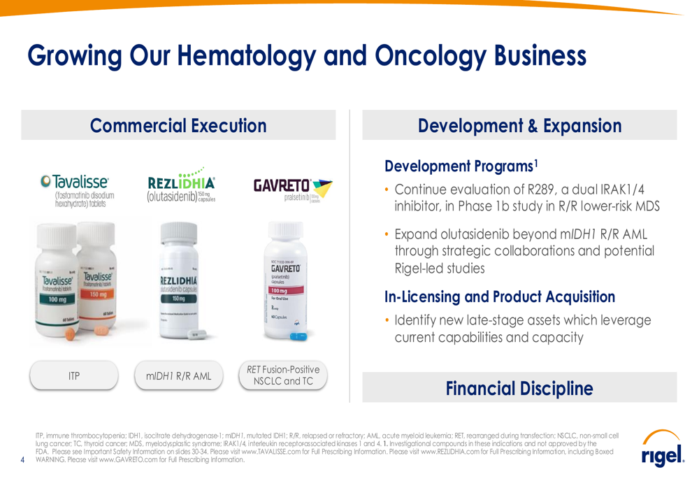 Rigel's commercial strategy centers on growing its hematology and oncology business through three key products while expanding its development pipeline. The company's approach combines commercial execution with strategic development initiatives: