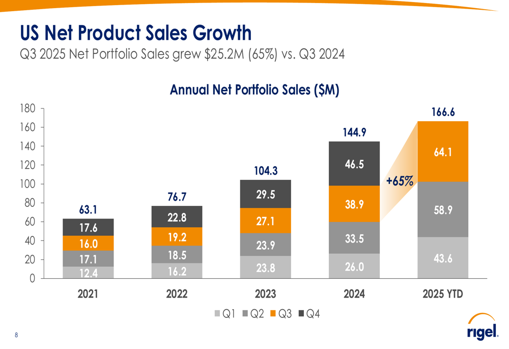 Rigel reported Q3 2025 net product sales of $64.1 million, representing a 65% increase compared to Q3 2024. Total revenue for the quarter reached $69.5 million, bolstered by $5.4 million in collaboration revenues from global partners.