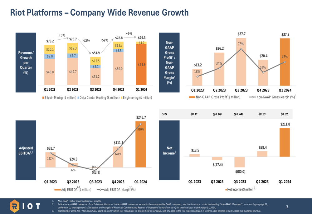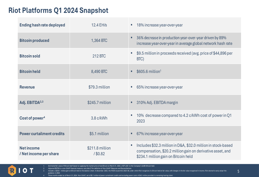 Riot’s Q1 2024 performance demonstrated the company’s ability to generate revenue growth despite operational challenges. While Bitcoin production decreased 36% year-over-year to 1,364 BTC (approximately 15 Bitcoin per day), the company’s diversified revenue streams and operational efficiencies helped drive overall financial improvement.