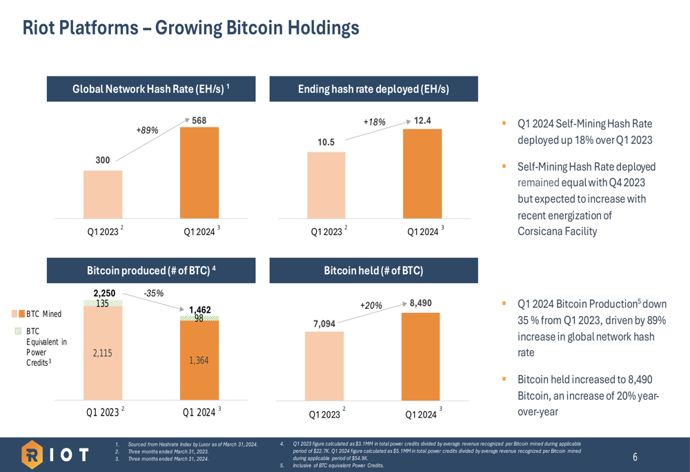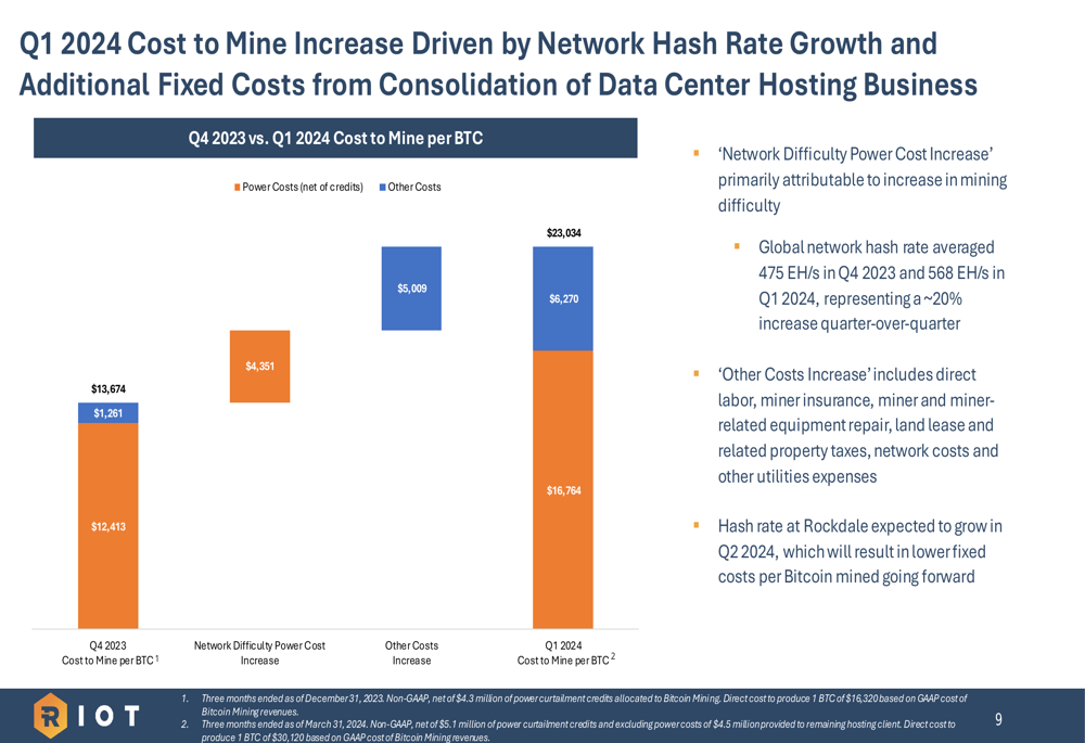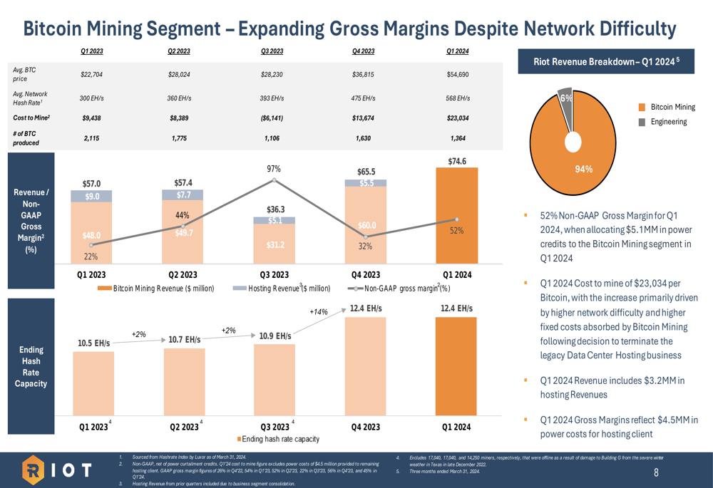 Riot positions itself as a low-cost Bitcoin producer with a direct cost to mine of $23,034 per Bitcoin in Q1 2024. While this represents an increase from previous quarters due to network difficulty growth, the company maintains that its vertically integrated approach and power strategy provide competitive advantages.