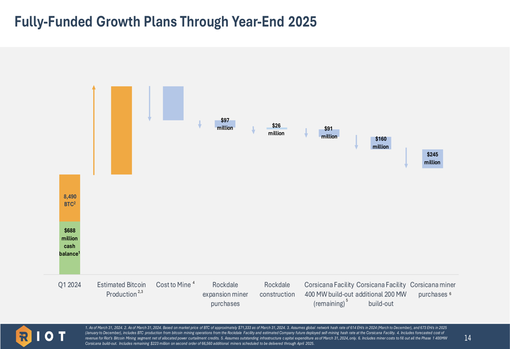 Riot emphasized that its growth plans through 2025 are fully funded with existing cash reserves of $688 million. The company has allocated capital for Bitcoin production, infrastructure development at its Rockdale and Corsicana facilities, and miner purchases to support its hash rate expansion targets.