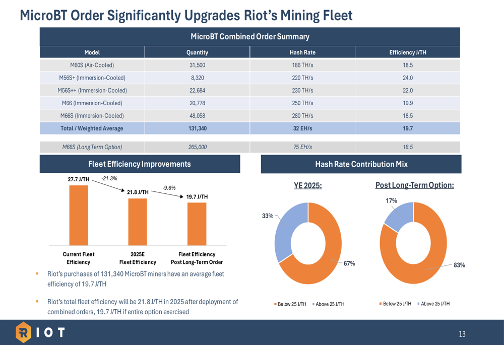 A significant component of Riot’s expansion strategy involves upgrading its mining fleet with more efficient equipment. The company has placed a substantial order with MicroBT for next-generation miners that will significantly improve operational efficiency.