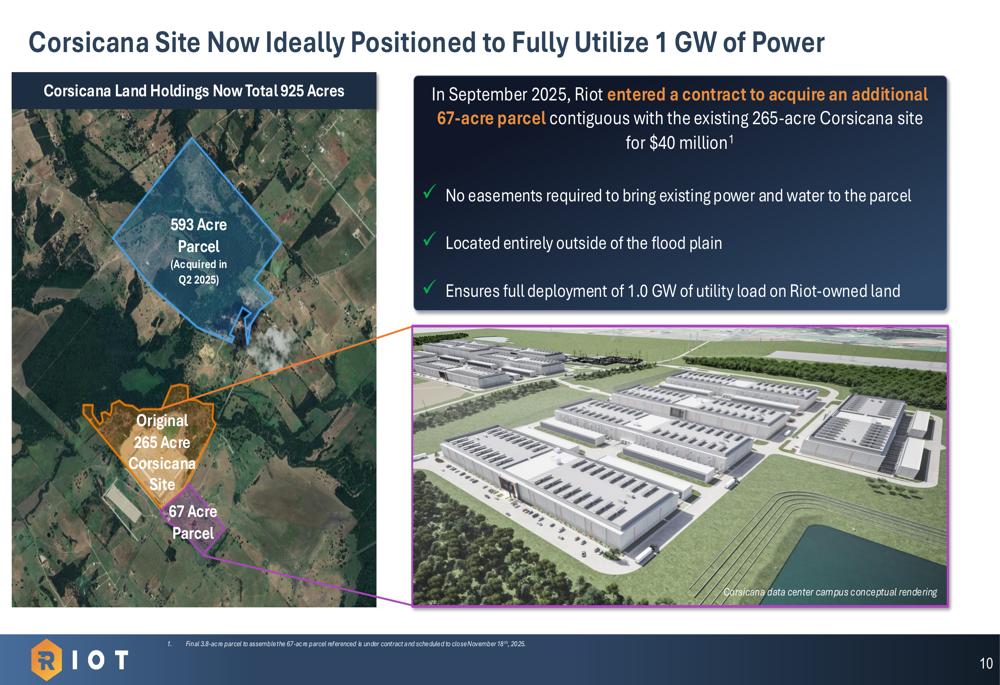 A central focus of Riot’s presentation was its progress in developing the Corsicana Data Center campus. The company announced the initiation of core and shell development for the first two buildings, which will represent 112 MW of critical IT load capacity. Riot also acquired an additional 67-acre parcel adjacent to the existing site, bringing total Corsicana land holdings to 925 acres.
