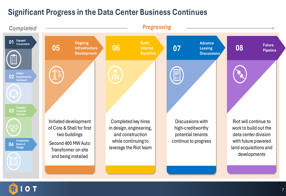 As illustrated in the following slide, Riot has made significant progress in advancing its data center business: