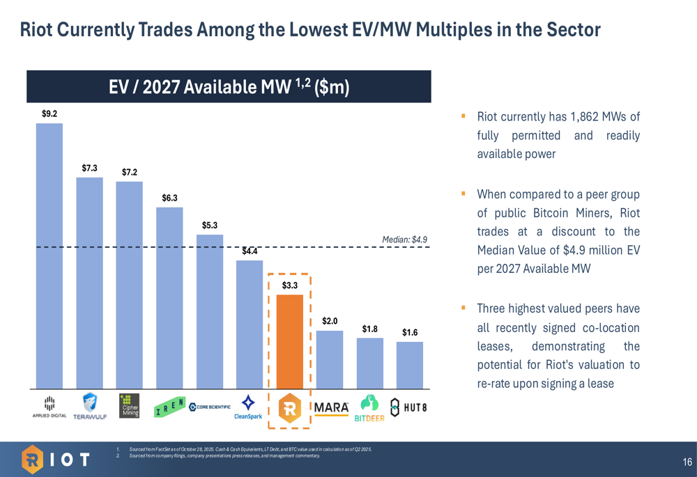 The company noted that it currently trades at one of the lowest EV/MW multiples in the sector at $3.3 million per 2027 Available MW, below the peer median of $4.9 million. Riot suggested potential for valuation re-rating upon signing co-location leases, similar to higher-valued peers: