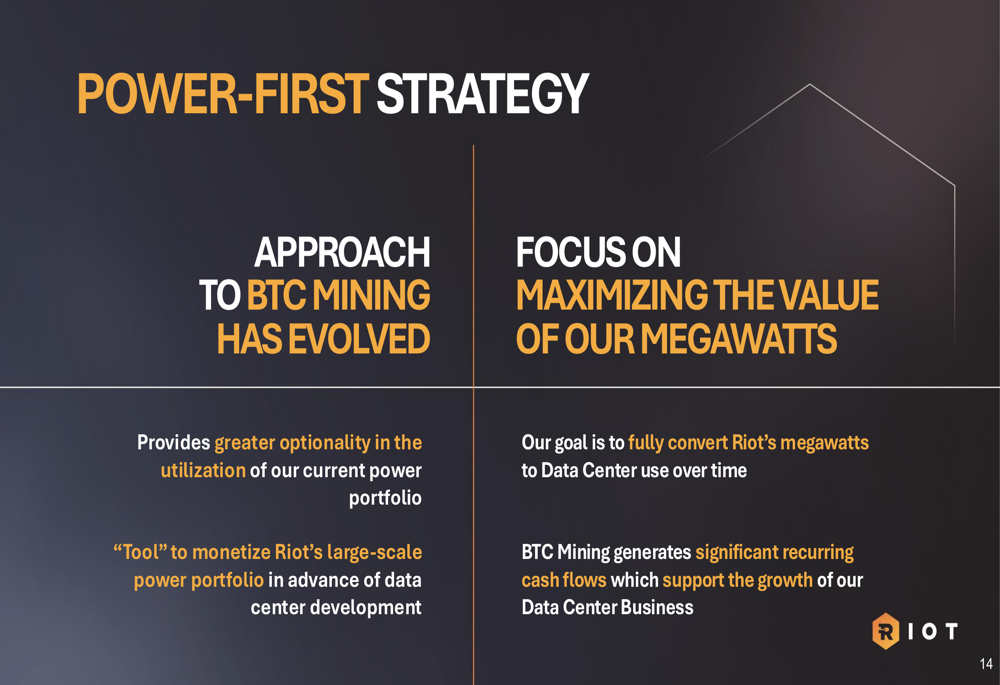 Riot’s "Power-First Strategy" represents an evolution in its approach to Bitcoin mining, providing greater optionality in utilizing its power portfolio while generating cash flows to support data center development: