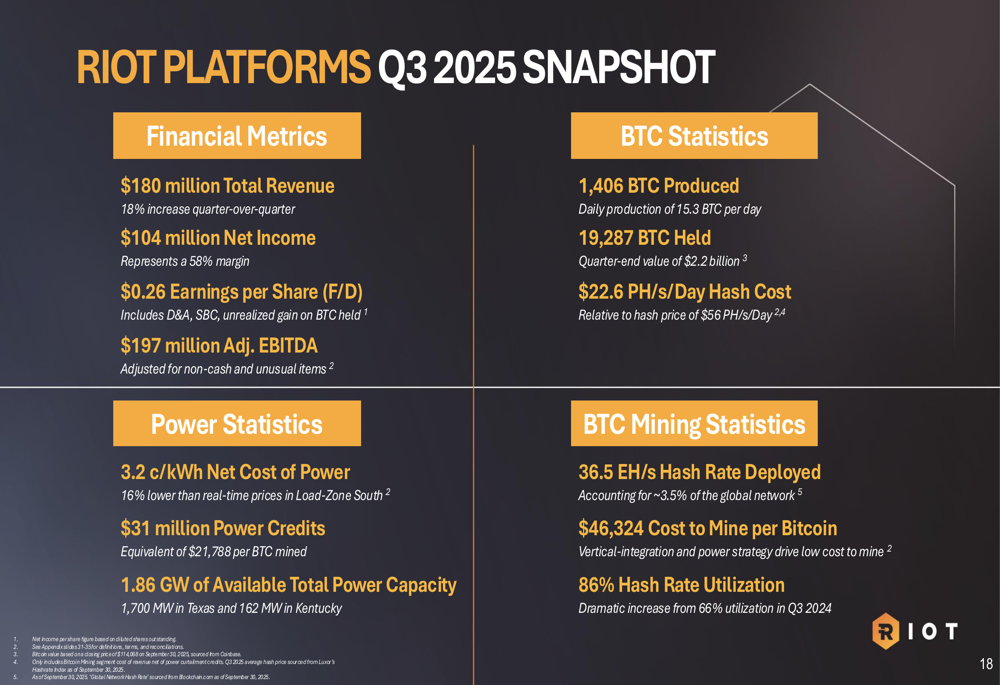 Riot reported strong financial results for Q3 2025, with net income reaching $104 million (representing a 58% margin) and earnings per share of $0.26, significantly outperforming analyst expectations of -$0.16. Adjusted EBITDA came in at $197 million.