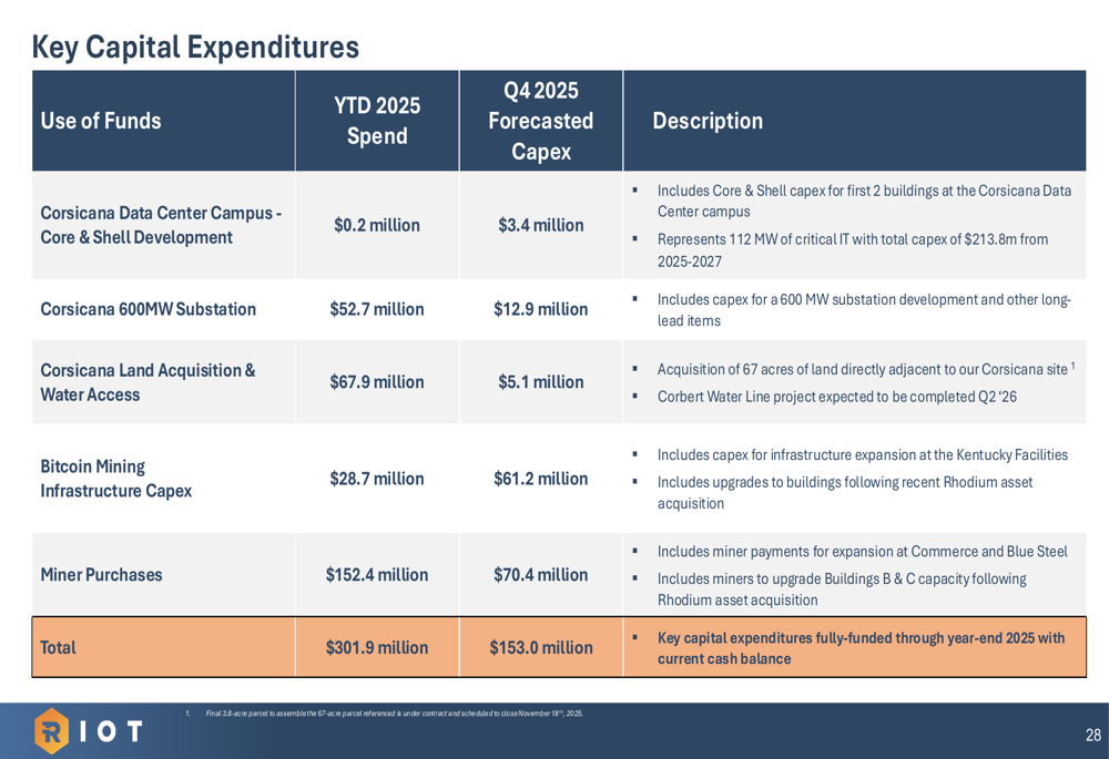 The company outlined its key capital expenditures for the remainder of 2025, totaling $153 million for Q4, with the largest allocations going to miner purchases ($70.4 million) and Bitcoin mining infrastructure ($61.2 million):