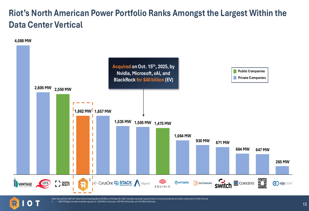 Riot emphasized its competitive positioning in the data center market, highlighting that its North American power portfolio of 1,862 MW ranks among the largest within the data center vertical: