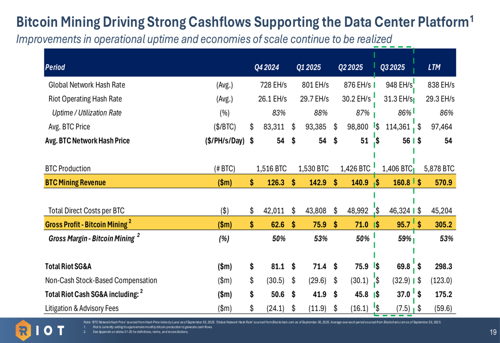 Riot’s Bitcoin mining efficiency improved significantly year-over-year, with hash rate utilization increasing to 86% in Q3 2025 from 66% in Q3 2024. The company’s gross margin for Bitcoin mining operations expanded to 59% in Q3 2025 from 42% in the same period last year, driven by operational improvements and power strategy.