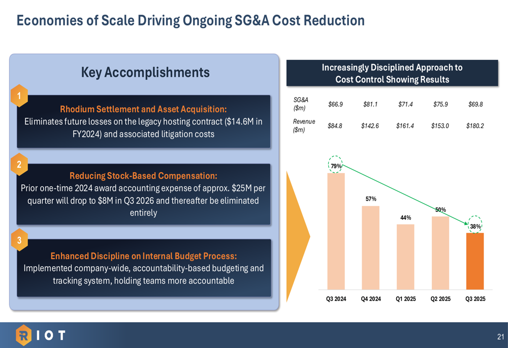 Riot has made substantial progress in reducing its SG&A costs as a percentage of revenue, from 79% in Q3 2024 to 38% in Q3 2025, through enhanced budget discipline and operational efficiencies: