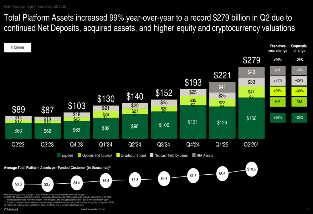 Robinhood’s total platform assets nearly doubled year-over-year, increasing 99% to $279 billion. This significant growth was driven by continued net deposits, acquired assets, and higher equity and cryptocurrency valuations.
