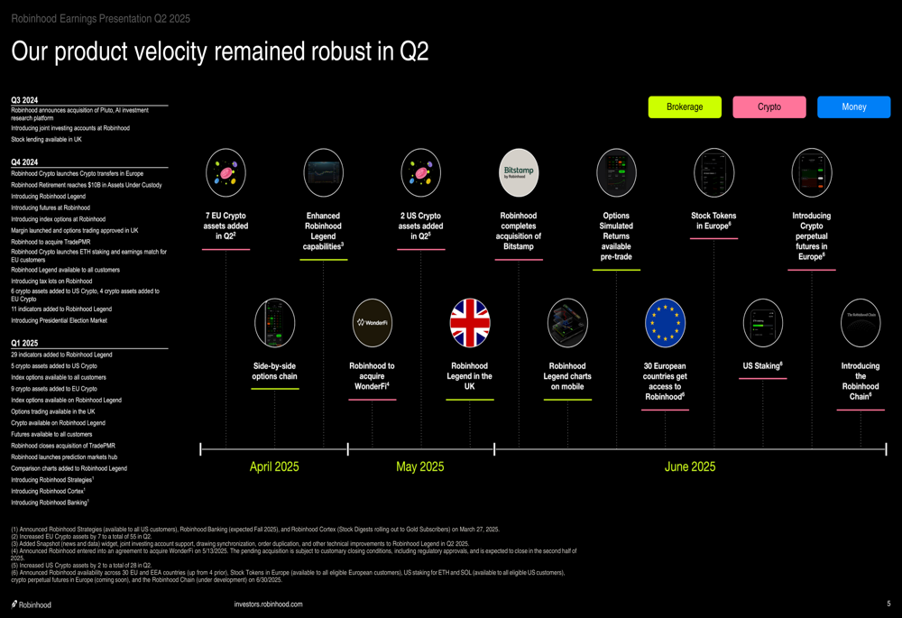 As illustrated in the product velocity slide, Robinhood launched several new features and services during Q2: