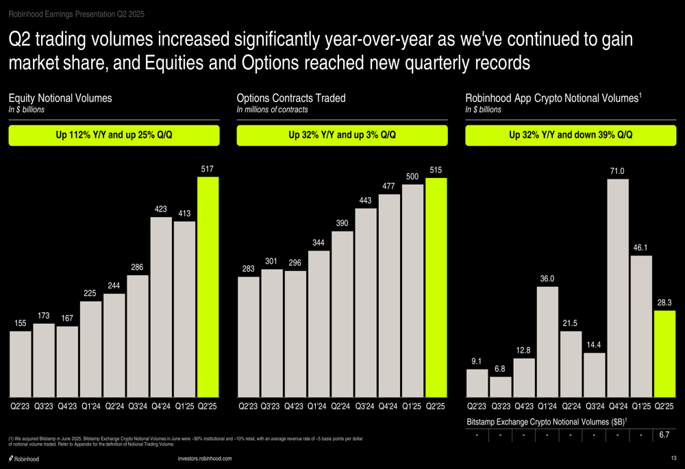 Transaction-based revenues were up 65% year-over-year to $539 million in Q2, with significant growth across equity, options, and crypto trading. Net interest revenues increased 25% year-over-year to a record $357 million, driven by growth in cash sweep and margin interest.