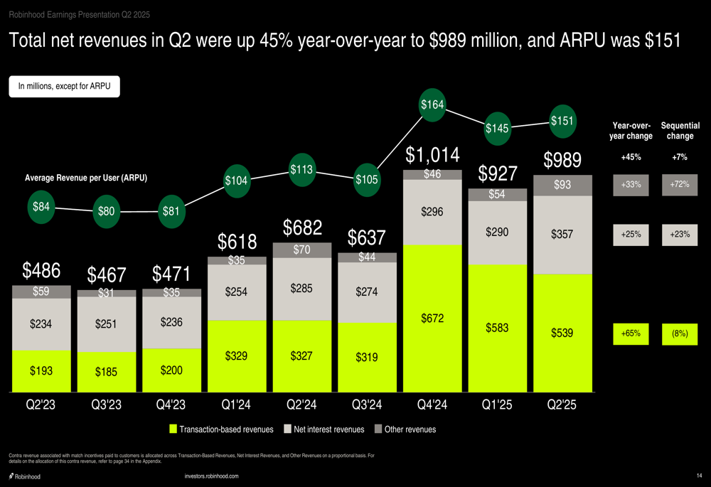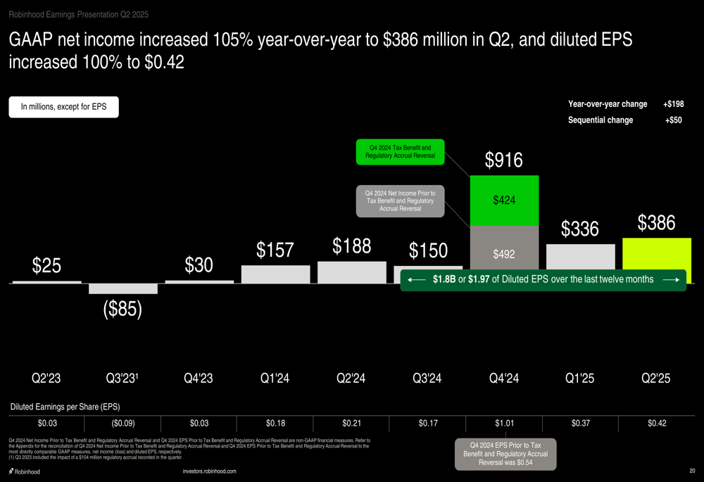 Robinhood’s Q2 2025 results showed robust growth across all key metrics. Total net revenues reached $989 million, up 45% year-over-year and 7% sequentially. The company reported net income of $386 million, up $198 million year-over-year, with diluted earnings per share of $0.42, a 100% increase from the previous year.