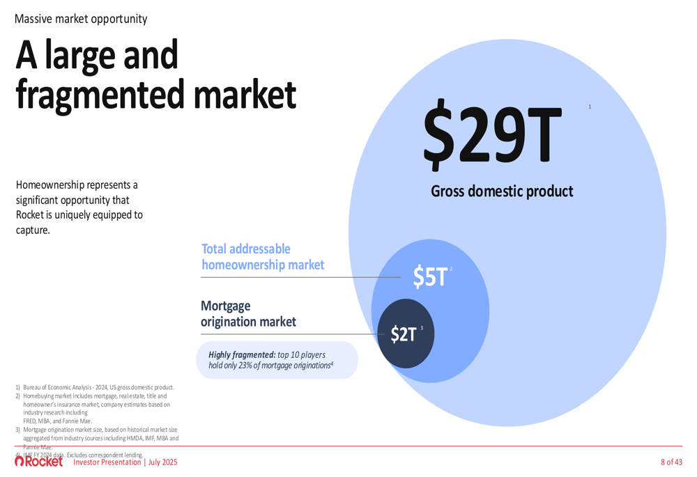 Rocket positioned itself within a large but fragmented market, with the top 10 players holding only 23% of mortgage originations. The company highlighted the total addressable homeownership market at $5 trillion, with the mortgage origination market at $2 trillion: