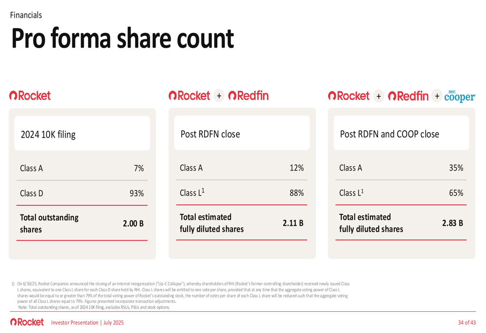 The presentation also referenced plans for the acquisition of Mr. Cooper, though with fewer details. The pro forma share count slide showed the potential ownership structure following both acquisitions, with Class A shares increasing from 7% to 35% of the total: