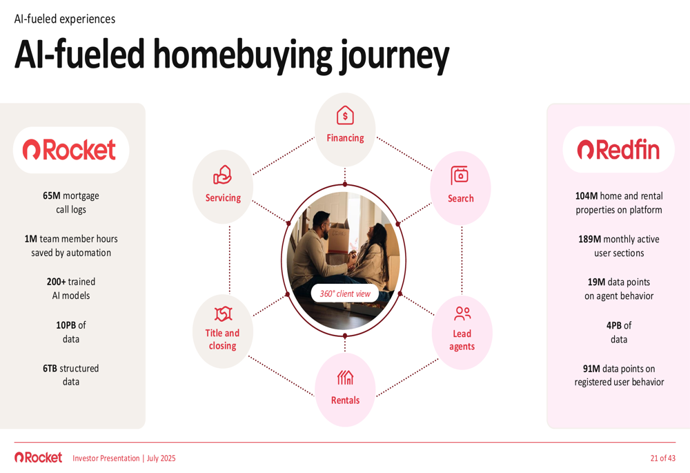 The following slide illustrates how AI is being integrated throughout the homebuying journey, leveraging massive datasets from both Rocket and Redfin:
