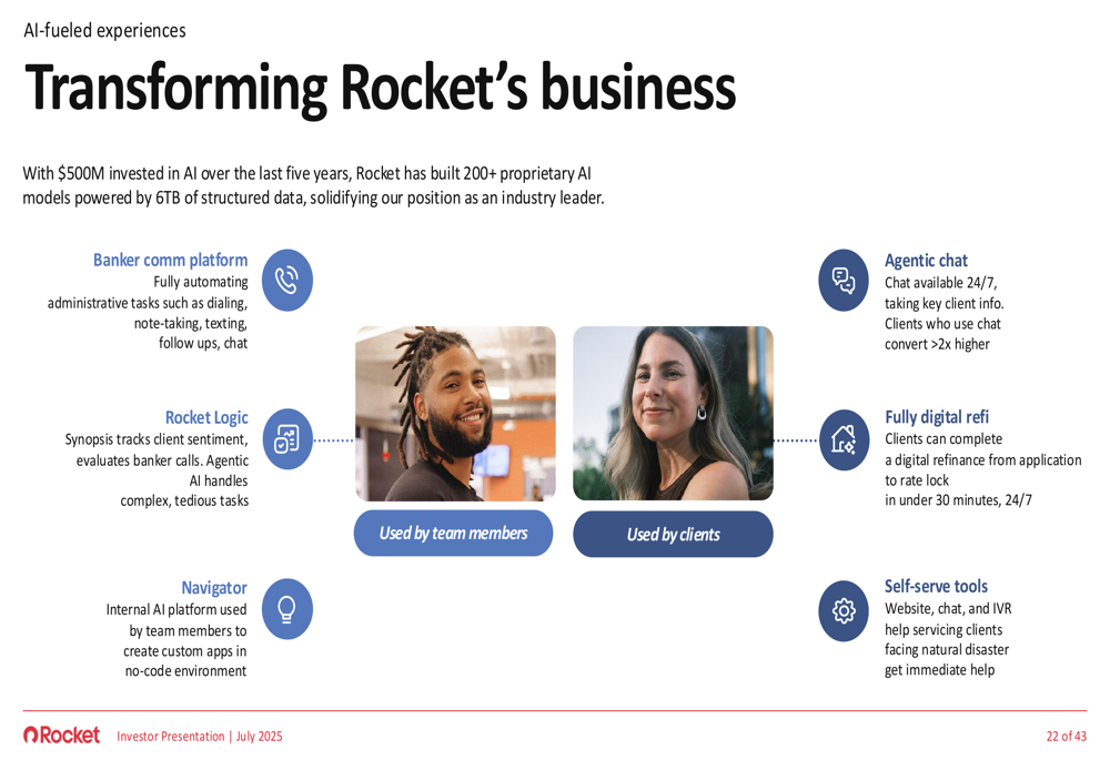 Rocket emphasized its significant investments in artificial intelligence, reporting $500 million invested in AI over the past five years resulting in 200+ proprietary AI models. The company presented AI as a key differentiator and growth driver across its business operations.