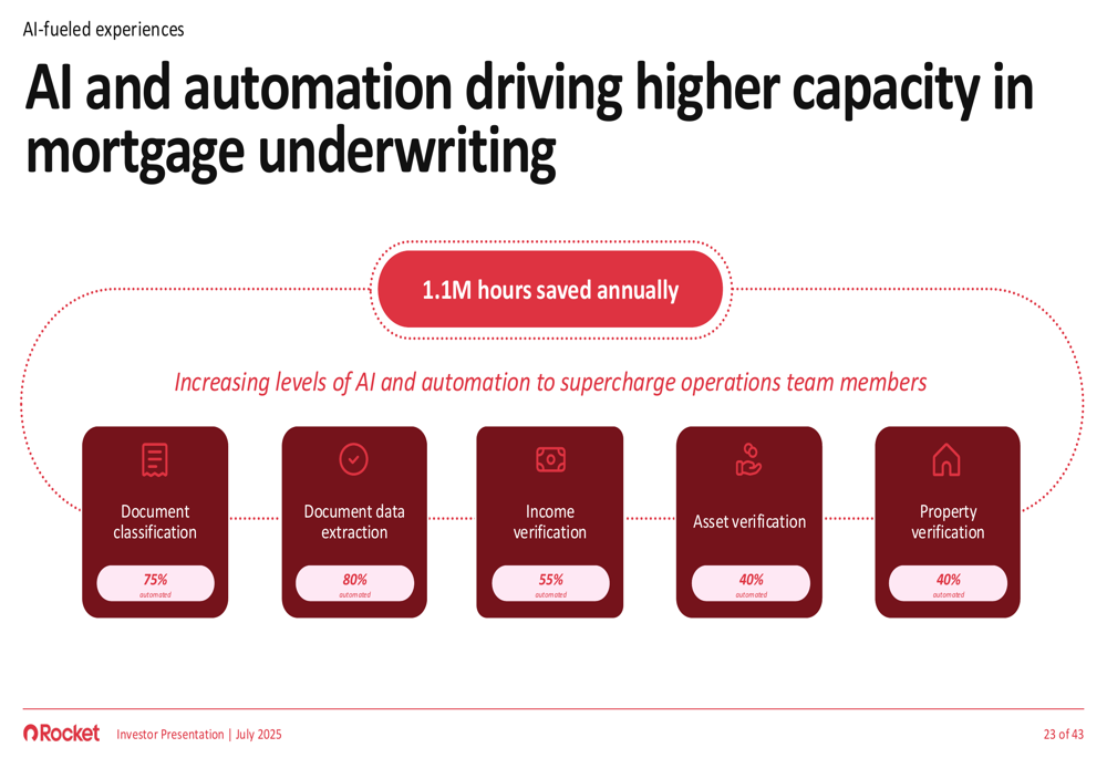 Rocket also detailed how AI and automation are driving higher capacity in mortgage underwriting, with significant portions of document classification (75%), data extraction (80%), and verification processes being automated: