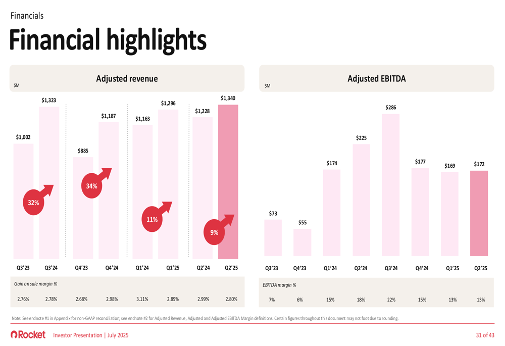Looking ahead, Rocket projects Q3 adjusted revenue between $1.6 billion and $1.75 billion, anticipating continued momentum in the purchase market. The company remains focused on completing the acquisition of Mr. Cooper by Q4 and fully integrating Redfin into its platform.