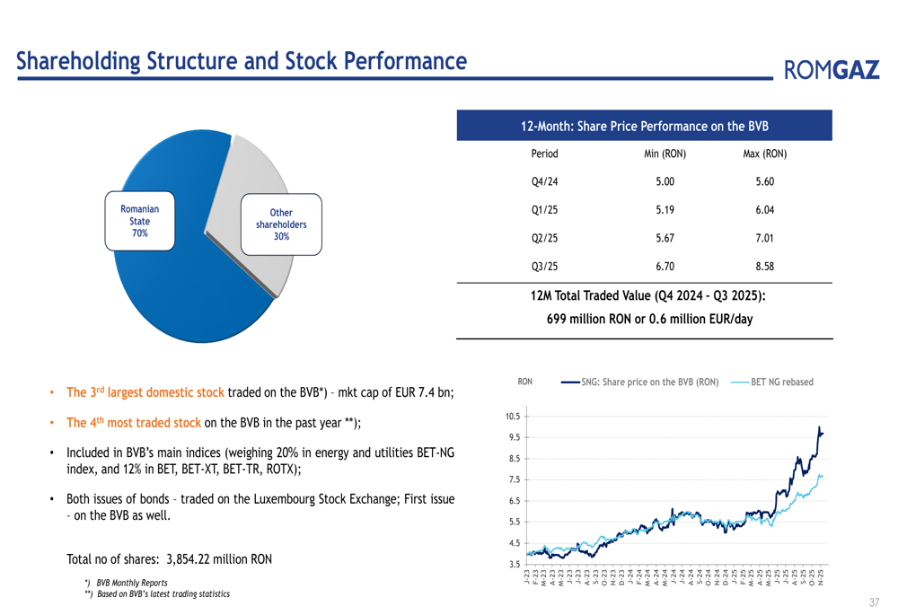 Romanian natural gas producer Societatea Nationala de Gaze Naturale Romgaz SA (BVB:SNG) released its Q3 2025 investor presentation on November 14, showcasing strong financial performance and strategic developments. The company's stock price has responded positively to these results, trading at RON 6.09, up 1.32% following the announcement, and has surged approximately 90% year-to-date according to company executives.