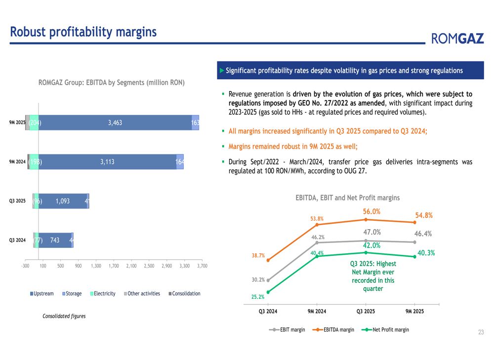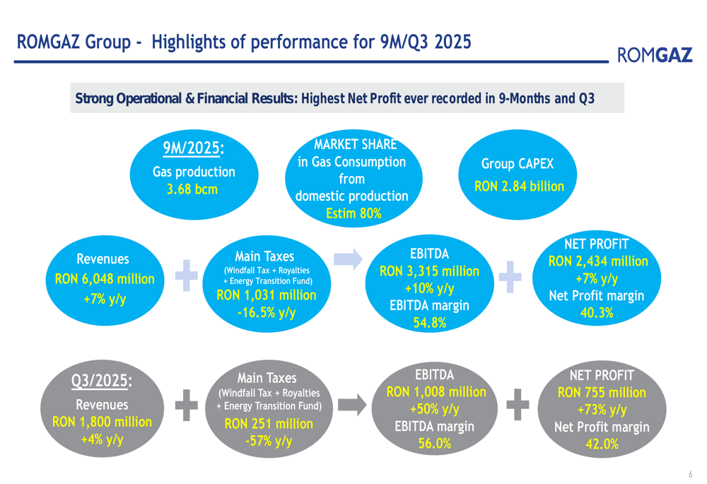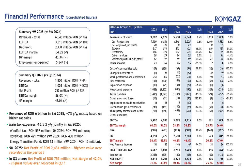 Romgaz delivered exceptional financial results for Q3 2025, with net profit increasing by 73% year-over-year to RON 755 million. This impressive growth was supported by a 4% increase in quarterly revenues to RON 1,800 million and a substantial 50% rise in EBITDA to RON 1,008 million.