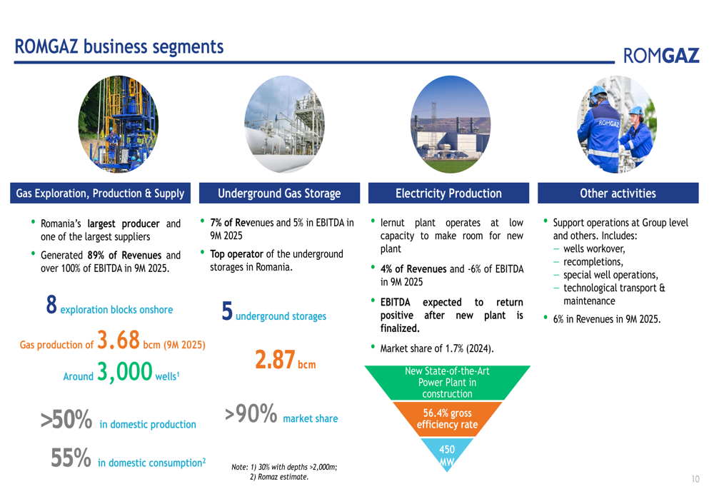 Romgaz's business is diversified across four main segments, with gas exploration, production, and supply generating 89% of revenues and over 100% of EBITDA in 9M 2025. The company also operates in underground gas storage (7% of revenues), electricity production (4% of revenues), and other supporting activities (6% of revenues).