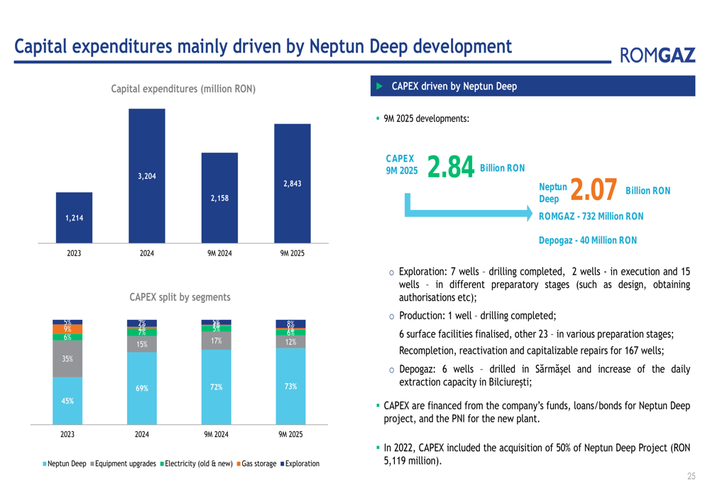 Capital expenditures for 9M 2025 reached RON 2.84 billion, with RON 2.07 billion allocated to the strategic Neptun Deep project. Additional investments were directed toward exploration and production activities, with 7 wells being drilled and 2 in execution during this period.