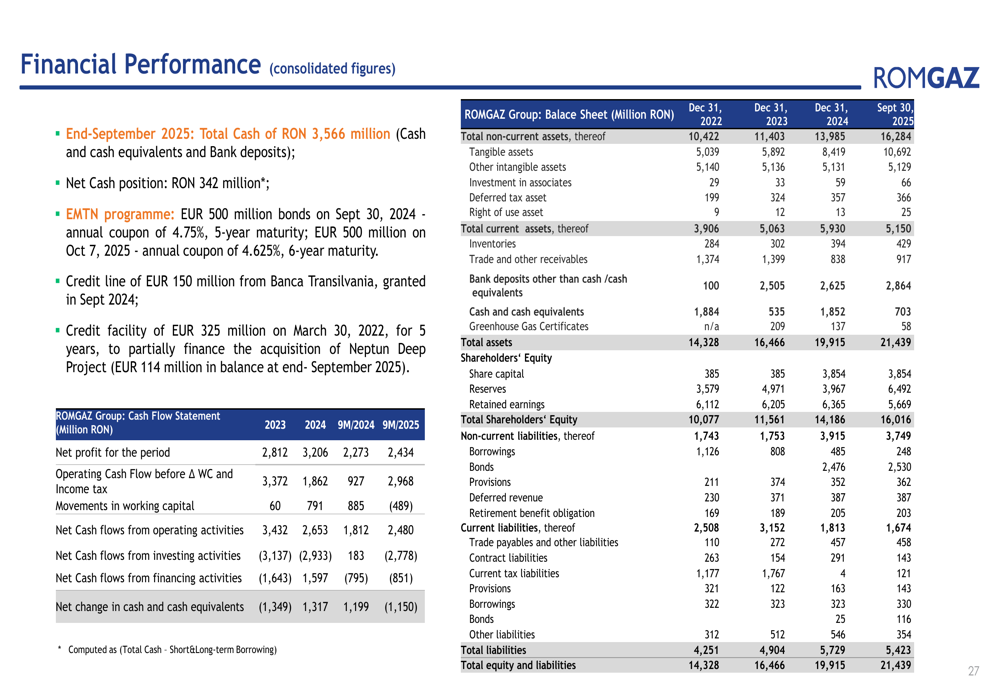 Romgaz maintains a strong balance sheet with a total cash position of RON 3,566 million and a net cash position of RON 342 million as of September 30, 2025. The company has successfully implemented an EMTN (Euro Medium Term Note) program with two EUR 500 million bond issuances (September 30, 2024, and October 7, 2025), along with credit lines totaling EUR 475 million.