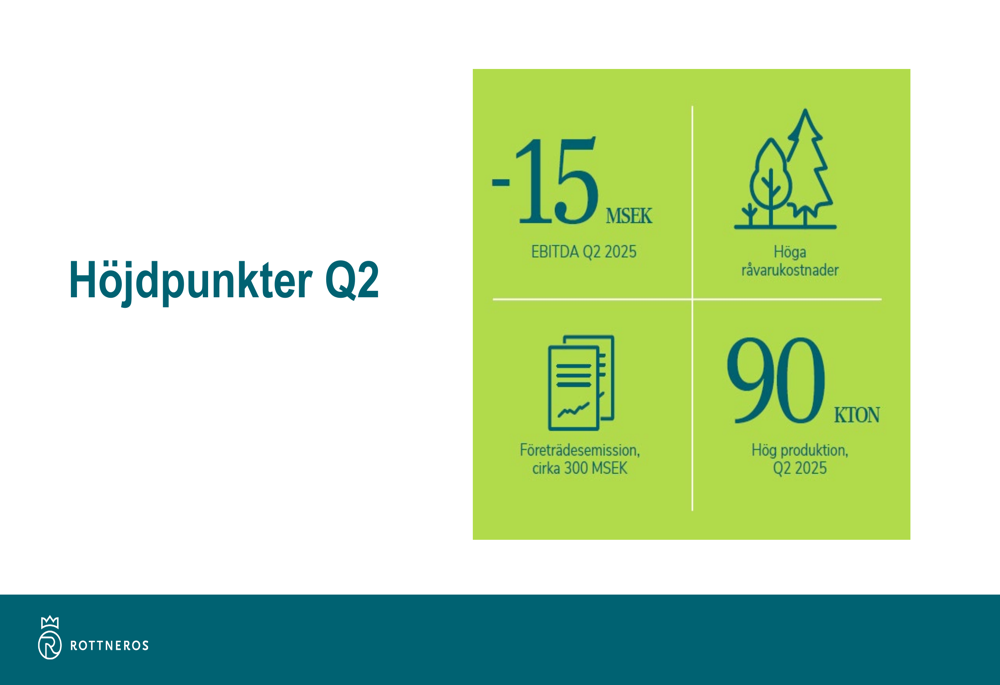 Rottneros reported a negative EBITDA of -15 MSEK for Q2 2025, a substantial decline from the positive 65 MSEK EBIT reported in Q2 2024. Despite the financial challenges, the company achieved high production of 90 KTON during the quarter, demonstrating operational efficiency despite market headwinds.