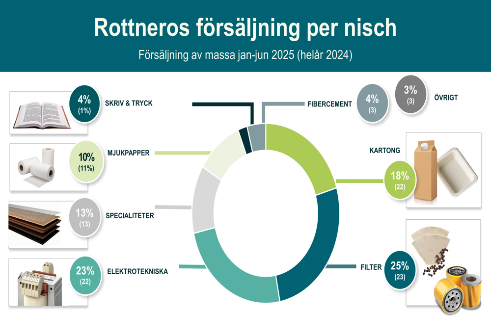 Despite current challenges, Rottneros maintains a diversified sales strategy across multiple niche markets. The company’s sales breakdown reveals a focus on specialized segments, with Filter (25%), Electrotechnical (23%), and Cardboard (18%) representing the largest portions:
