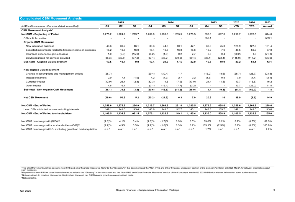 The consolidated CSM movement analysis shows a slight decline in Q3 2025, with the ending balance at $1,258.6 million: