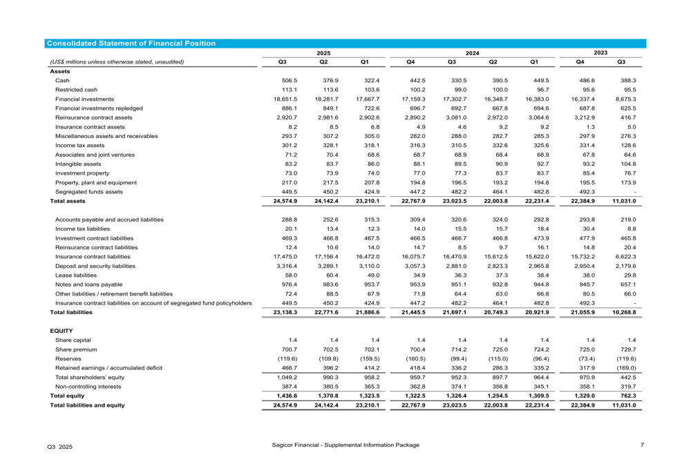 Sagicor maintained a strong balance sheet with total assets of $24.6 billion as of Q3 2025. The company's financial position is detailed in the consolidated statement of financial position: