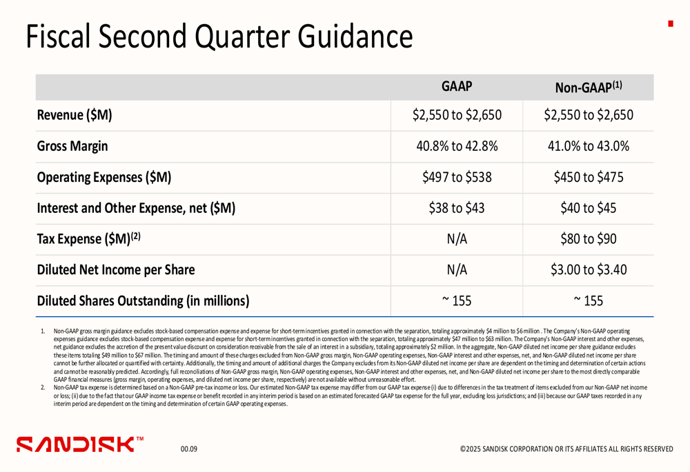 SanDisk provided an optimistic outlook for the second fiscal quarter, projecting revenue between $2.55 billion and $2.65 billion. The company expects non-GAAP gross margin to improve significantly to between 41% and 43%, with non-GAAP diluted earnings per share forecasted between $3.00 and $3.40.