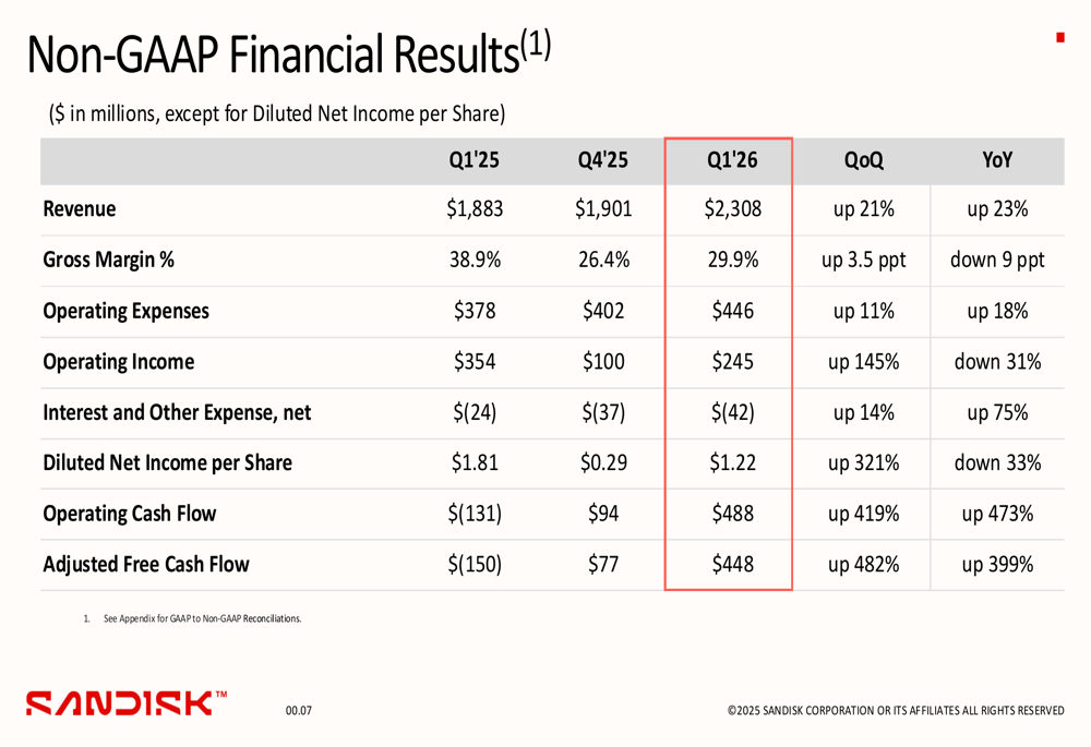 SanDisk reported revenue of $2.3 billion for Q1 FY2026, representing a 21% increase quarter-over-quarter and a 23% year-over-year improvement. The company achieved a non-GAAP gross margin of 29.9%, up 3.5 percentage points sequentially but down 9 percentage points compared to the same quarter last year.