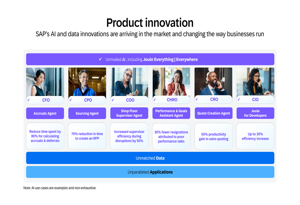 SAP reported significant efficiency gains from AI implementation, including an 80% reduction in time spent calculating accruals and deferrals for finance departments, 70% reduction in time to create RFPs for procurement, and 50% productivity gains in sales quoting.