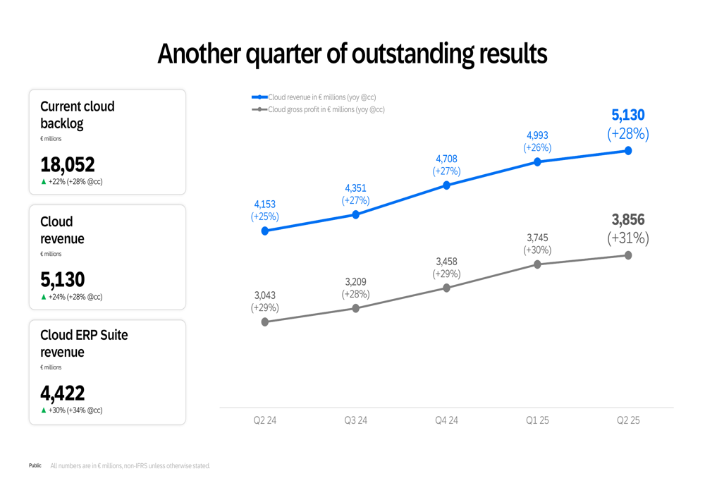 The following chart illustrates SAP’s consistent cloud revenue and gross profit growth over recent quarters:
