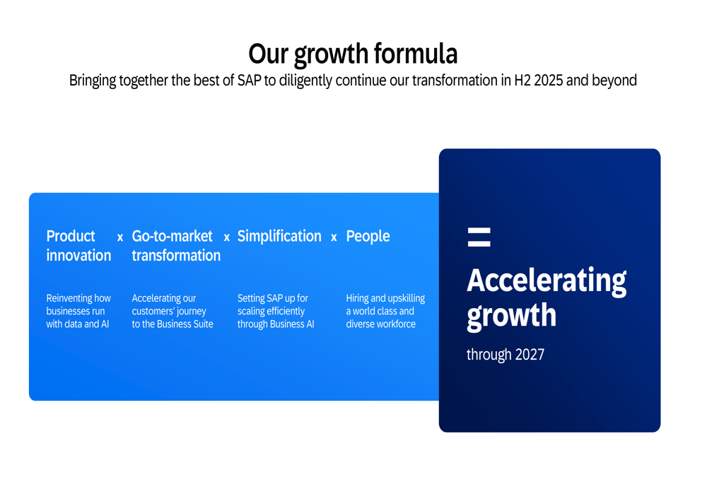 SAP outlined its strategic growth formula centered around four key pillars: Product Innovation, Go-to-Market, Simplification, and People Transformation. The company emphasized its goal of accelerating growth through 2027.