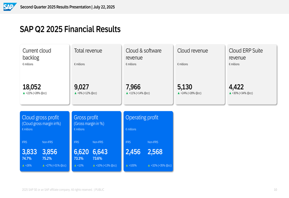 SAP reported total revenue of €9.03 billion for Q2 2025, representing a 9% increase year-over-year (12% at constant currency). The company’s cloud and software revenue reached €7.97 billion, up 11% (14% at constant currency), while operating profit (non-IFRS) surged 32% to €2.57 billion.