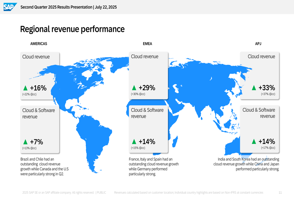 SAP reported strong growth across all geographic regions, with particularly impressive results in Asia-Pacific and Japan (APJ). Cloud revenue in the APJ region increased by 33% (37% at constant currency), while EMEA saw 29% growth (30% at constant currency), and the Americas achieved 16% growth (22% at constant currency).