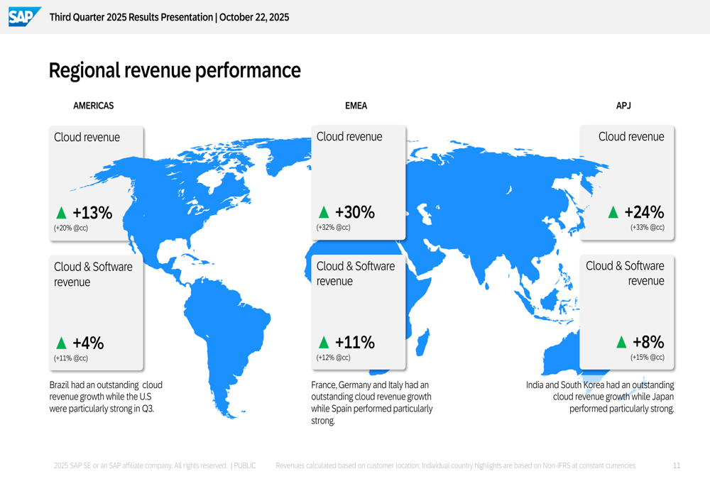 SAP’s performance varied significantly across regions, with EMEA (Europe, Middle East, and Africa) showing the strongest cloud revenue growth at 30% (32% at constant currency). The Americas region posted 13% growth (20% at constant currency) in cloud revenue, while the Asia-Pacific Japan (APJ) region grew by 24% (33% at constant currency).