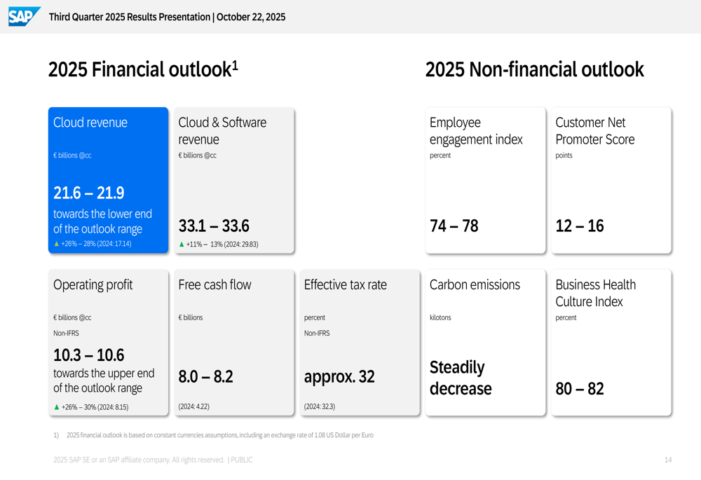 SAP also provided non-financial metrics in its outlook, targeting an employee engagement index of 74-78%, a customer Net Promoter Score of 12-16, and a Business Health Culture Index of 80-82%.