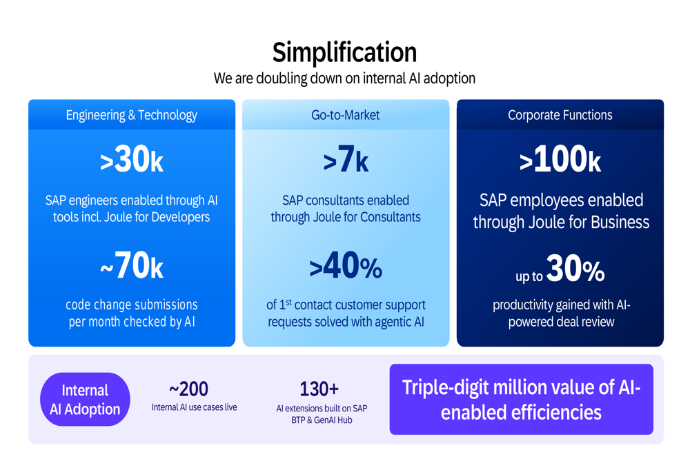 SAP also highlighted its internal AI adoption, reporting over 200 internal AI use cases already implemented. The company has enabled more than 30,000 engineers with AI tools, with approximately 70,000 code change submissions checked by AI monthly. Additionally, over 40% of first contact customer support requests are now solved using agentic AI.